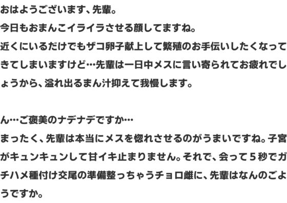 滅多に無いヤリチン主人公になって、後輩ちゃん達を犯しまくって下さい! 女性優位系作品が数多ひしめくDLsiteの中では珍しく「つよオス」系作品です。内容としてはタイトルの通り、誰にも媚びないクール系後輩ちゃんとの都合の良いセフレ性活。後輩ちゃんの淡々とした口調で語られるチン媚び台詞の数々に当方ギャップ勃起が止まりませんでした。終始後輩ちゃんと主人公との関係はあまではあるもの主人公が後輩ちゃんをマゾオナホとして使い潰す感じなので私のような反純愛ENDの人間も安心です。「まんイラ」「セックスアポ」「マゾイキ」等々素敵な台詞回しにも脱帽です。あと乳首当てゲームめちゃ好き。 音声素直に最高です。